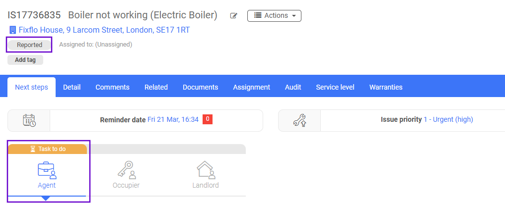 Select the issue as usual and remain on the 'Next steps' tab. This is the place you will need to be in order to use a works flow and progress the issue. The issue will begin with the issue status 'Reported'. This can be found towards the top of the page on the left hand side of the screen. Underneath the 'Reminder date' you will be able to see everyone involved with the issue and who the issue lies with.