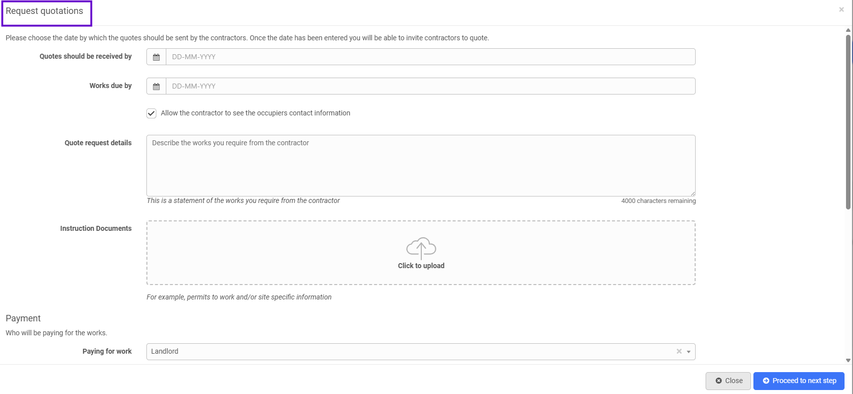 The 'Ideal work completion date' is completely optional and you can un-tick the box 'Allow the contractor to see the occupier contact information'. This will be ticked by default. The 'Quote request details' and 'Instruction documents' are also optional.