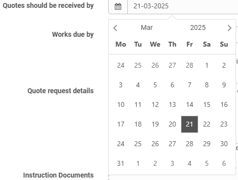 The 'Quotes should be received by' box must be filled out. When you click on the box, a calendar will appear. All you need to do is select a date and then the date will fill into the box. Please note that if the contractor does not provide a quote by the date you have given, the issue status will change to 'Request for quotes ended' and the issue will no longer sit with the contractor. Instead this will then be your 'Task to do'.
