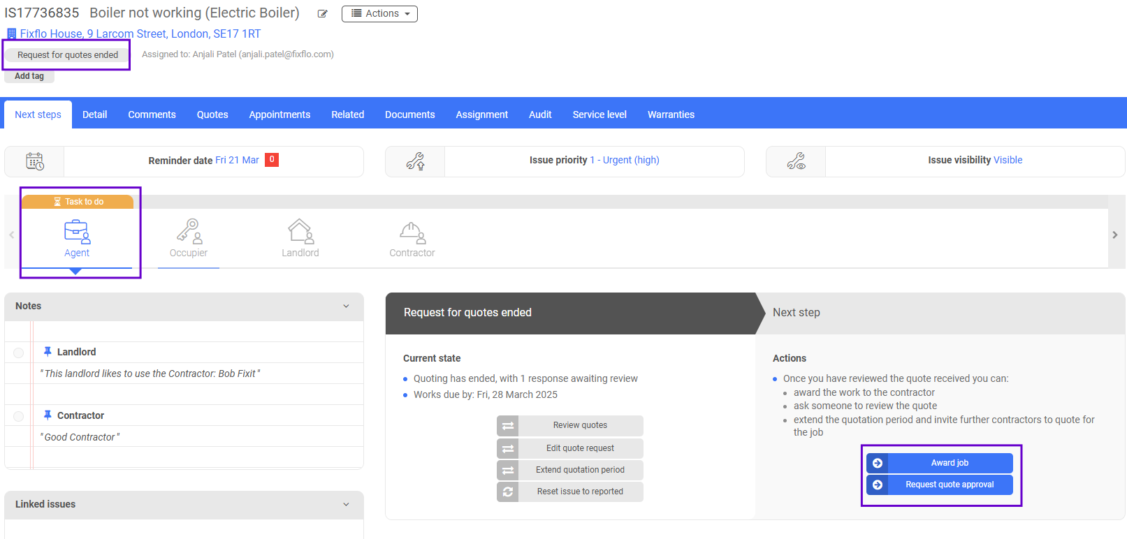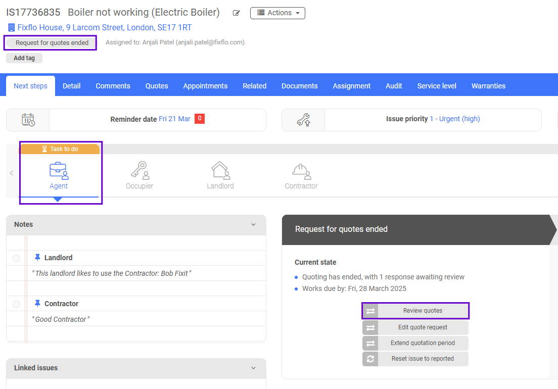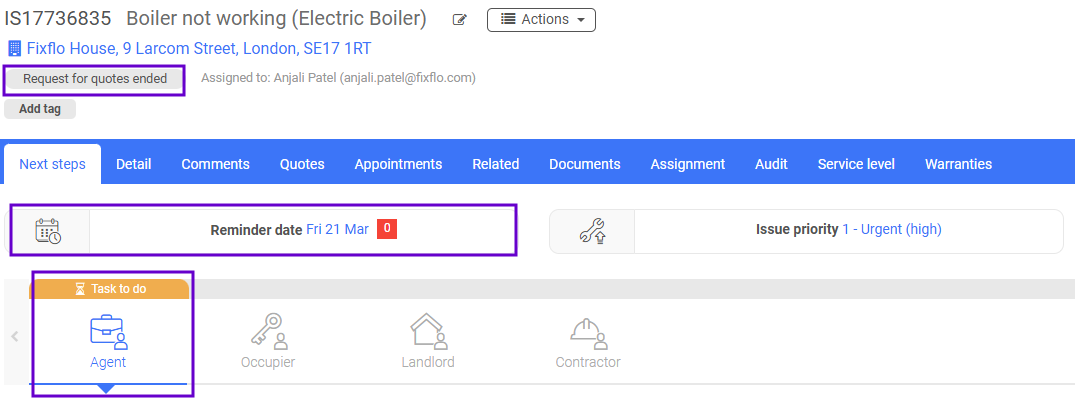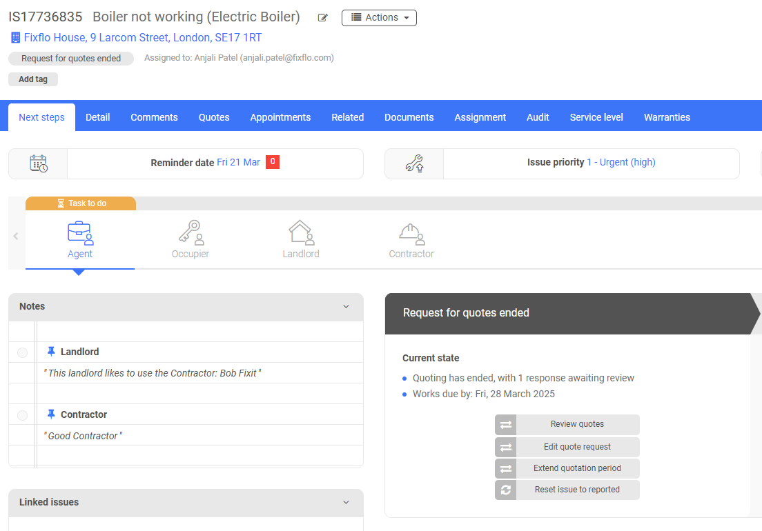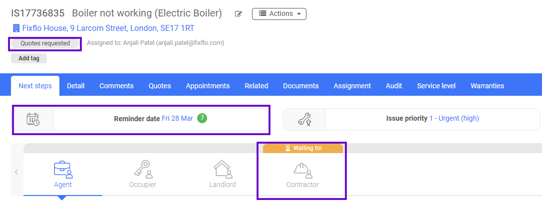 You will notice that the issue status will have automatically updated from 'Reported' to 'Quotes requested', the 'Reminder date' will have updated to a time and date in the future (this will reflect the date you provided when asked for a 'Quotes should be received by' date) and the 'Task to do' will have moved to 'Waiting for' contractor: