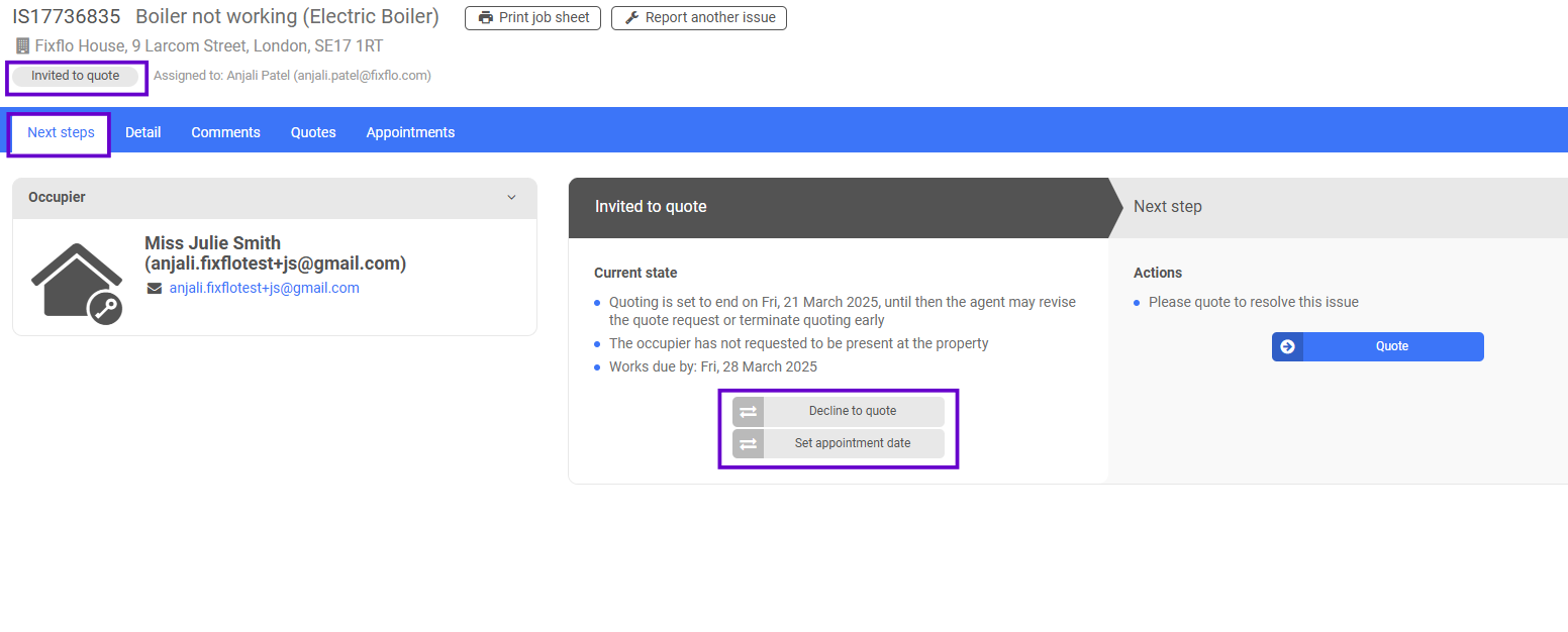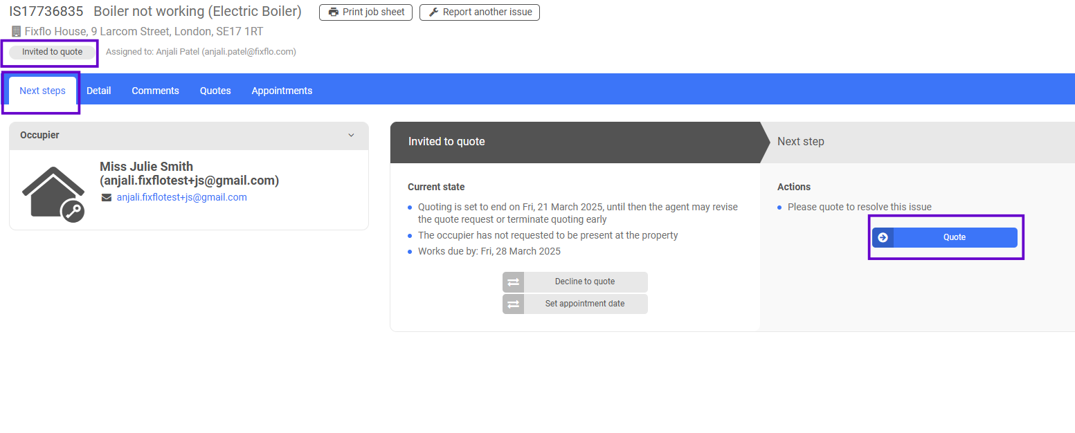 Here they can see the issue status and they can see that the next step is to 'Quote'. They can click on 'Detail' to see all of the details of the job and they can click on 'Comments' to send a message to the agent or the occupier. They also have an 'Appointments' tab where they will be able to manage appointments once they have entered the first one.
