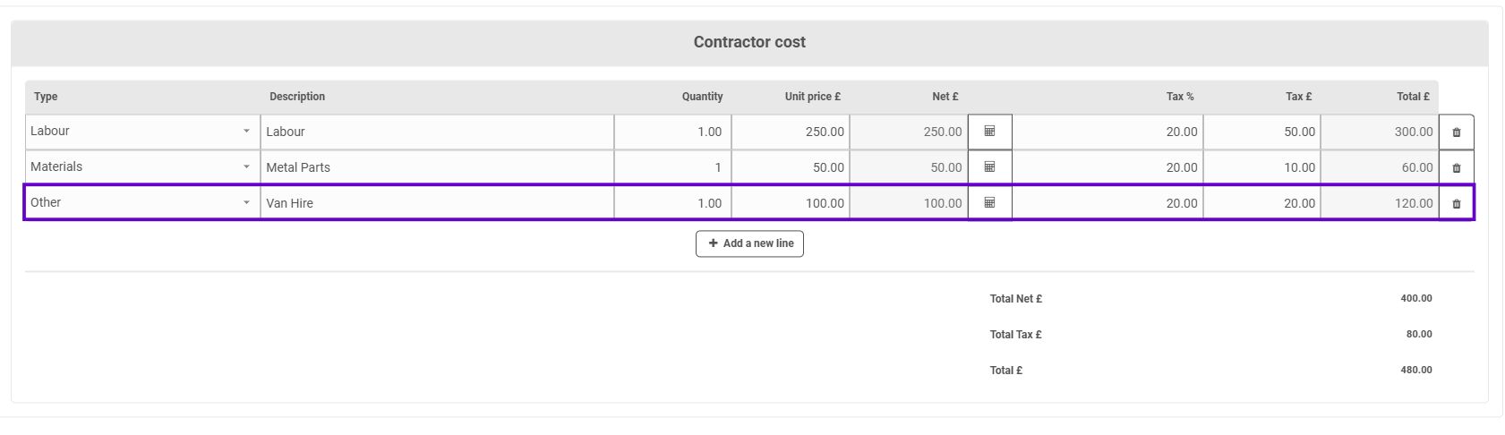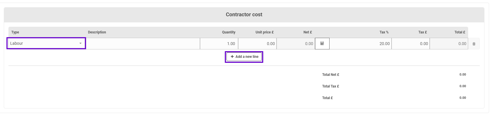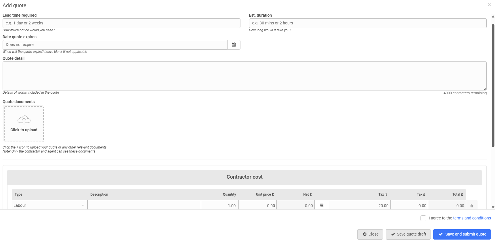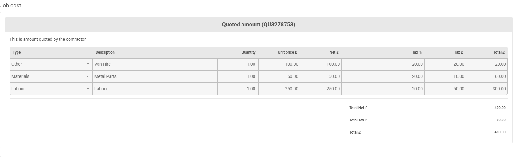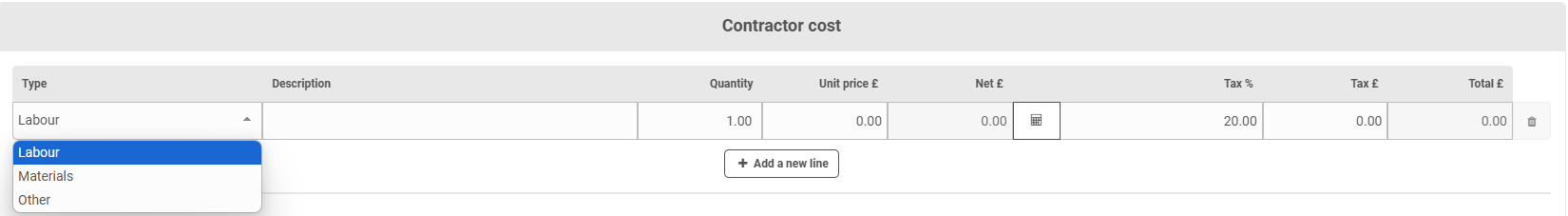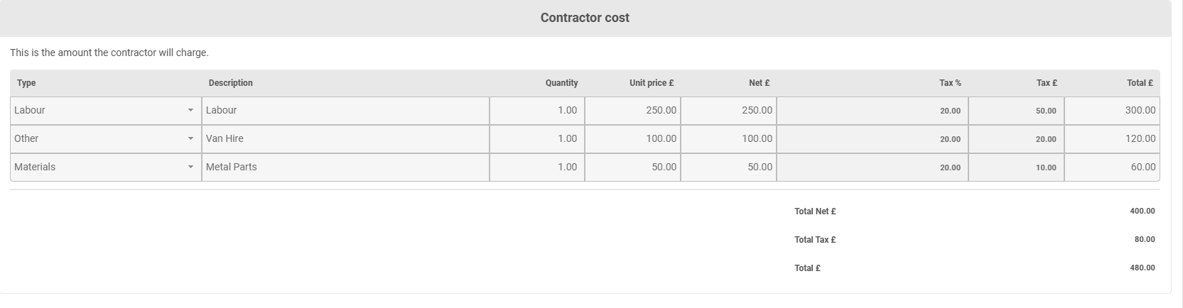 Underneath that on the pop up, the contractor is asked for a quote. They provide the cost, this is split between 'Labour', 'Materials' and 'Other' and they can add more than one row: