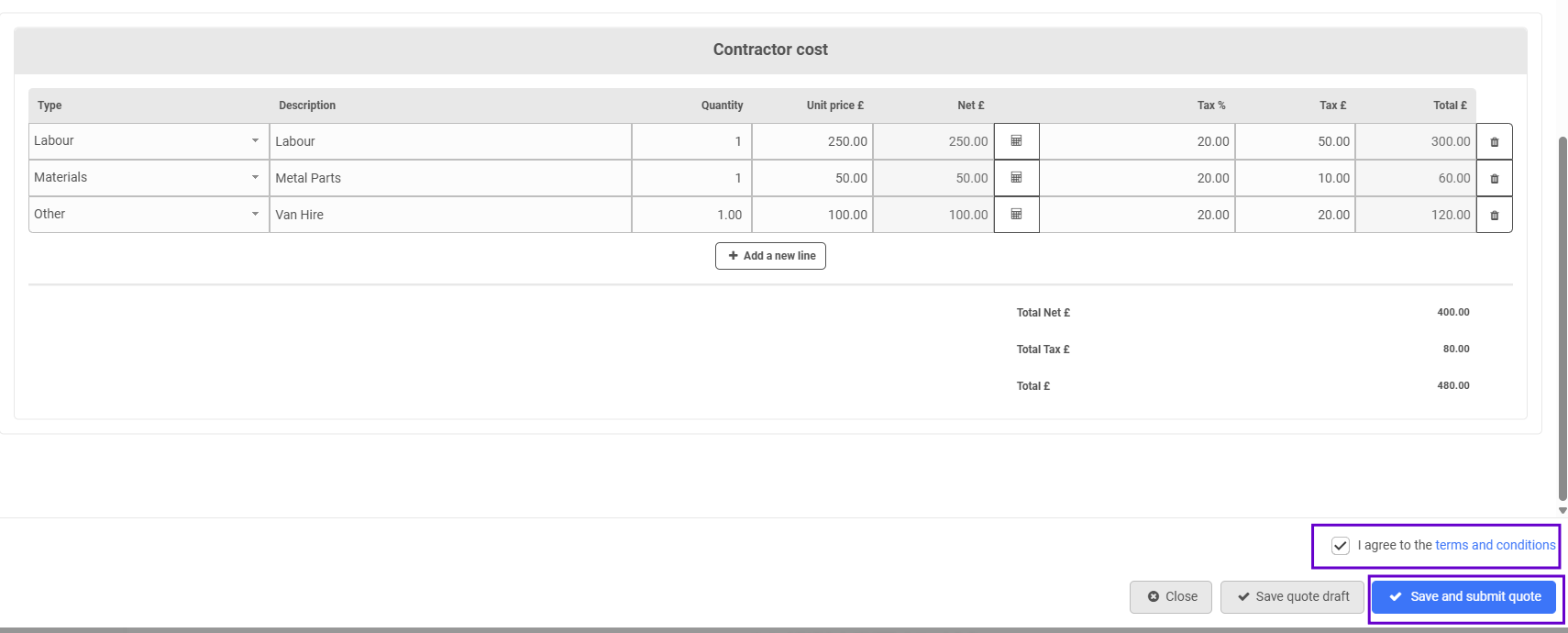 Underneath that they can put the contractor costs. The quoted amount will pull through, but they can make changes. Once they are happy, they will press 'Submit':