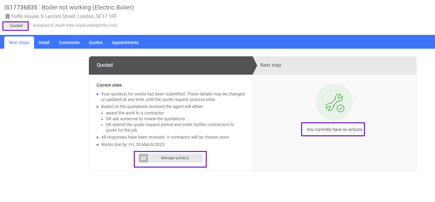 The contractor will then see that the issue status has now updated to 'Quoted' and that they have no further actions. They can click on 'Manage quote(s)' if they would like to review their quote(s) on the 'Quotes' tab. However the issue is now in the hands of the agent to progress the issue: