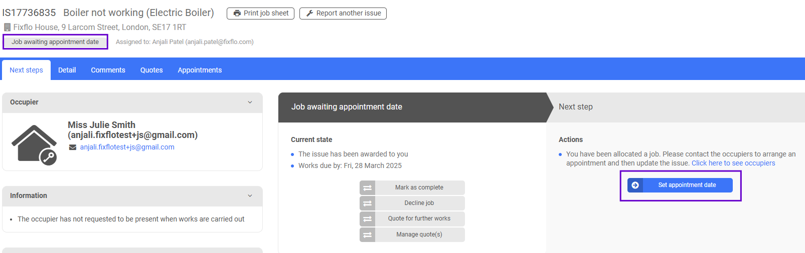 Before the contractor clicks on 'Set appointment date', it's important that they look at the information on the left hand side of the 'Next steps' tab as this shows whether the occupier would like to be present or not: