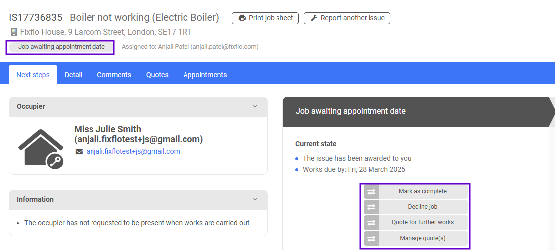 You will now notice that the issue status has updated to 'Job awarded, awaiting appointment date', the 'Reminder date' will have updated to a future date and then job is now with the contractor you awarded the job to: