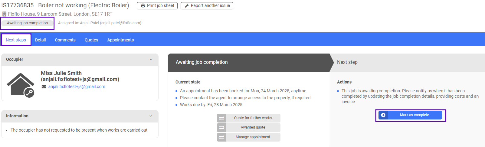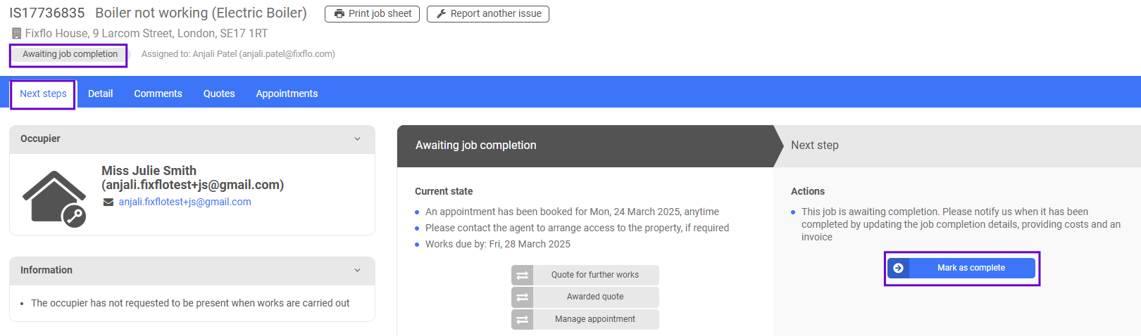 Back on the 'Next steps' tab the contractor would click on 'Mark as complete' where they can add the job completion details: