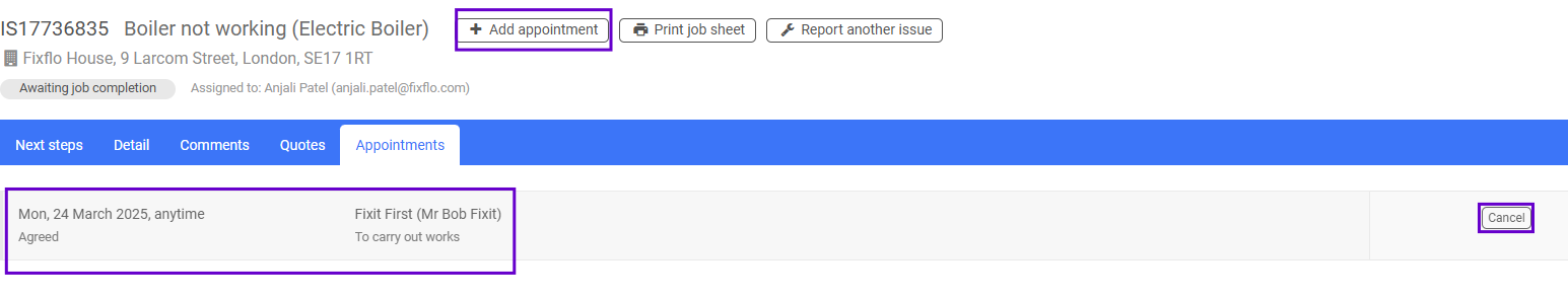 The appointment will be sitting in the 'Appointments' tab, where the contractor can cancel the appointment and add a follow up appointment if necessary: