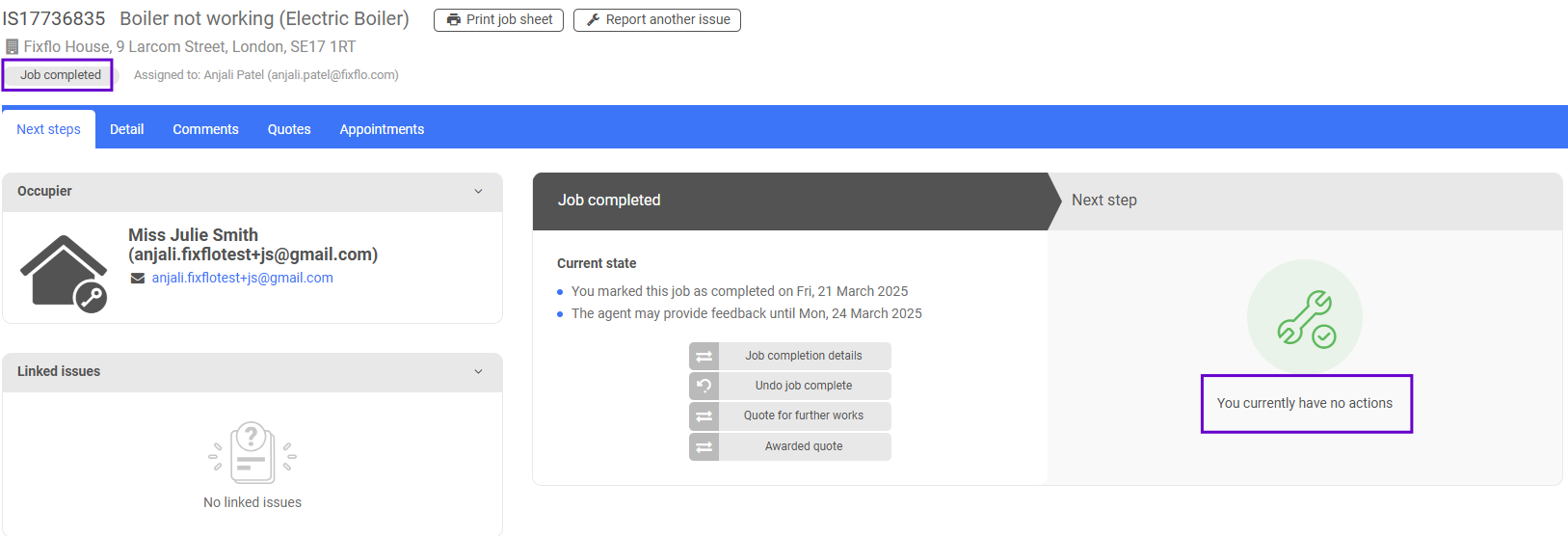 The contractor will then see the following screen, which will show them that the issue status has been updated to 'Job completed, awaiting feedback'. It will either update to that issue status or 'Job completed, ready for closure', depending on whether or not you have occupier feedback turned on. Now they have the option to 'Quote for further works', view their 'Job completion details', view their 'Job costs and invoices' or 'Undo job complete'. They can also see that they have no next step as they have no actions: