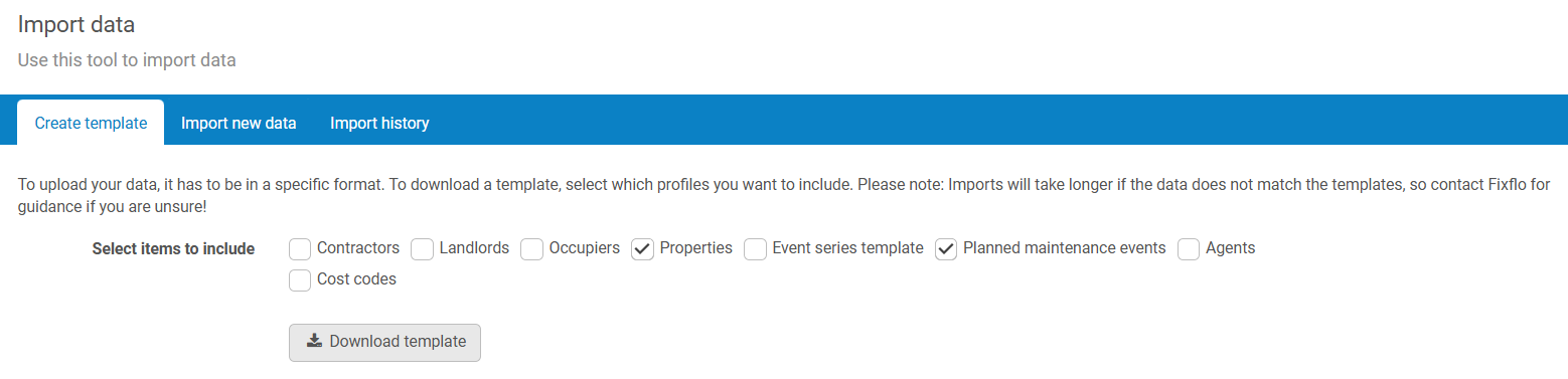 From here, you can select the data you would like to upload into Fixflo and then click Download template.