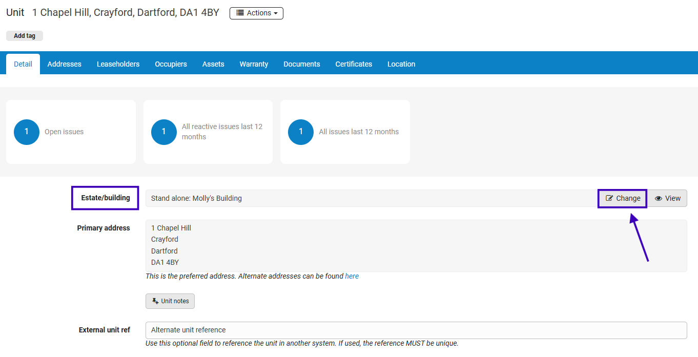 Once in the Unit profile, the page will go to the Detail tab by default. Start typing the building you would like to link this unit to in the Estate/Building search bar, select the relevant building and click Save: