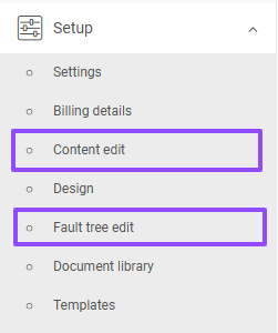 4. Back in your Fixflo system select the appropriate popup by going to 'Setup' and 'Content edit'. If you want to create a new pop-up go to 'Fault Tree Edit'.