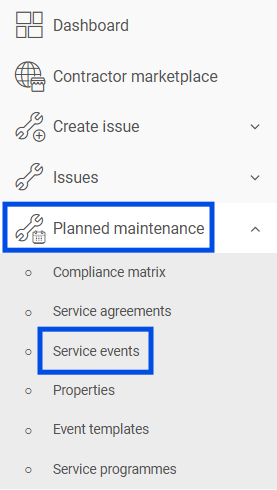 To create an event, please log in to Fixflo and click on Planned Maintenance > Service Events from the left-hand navigation bar: