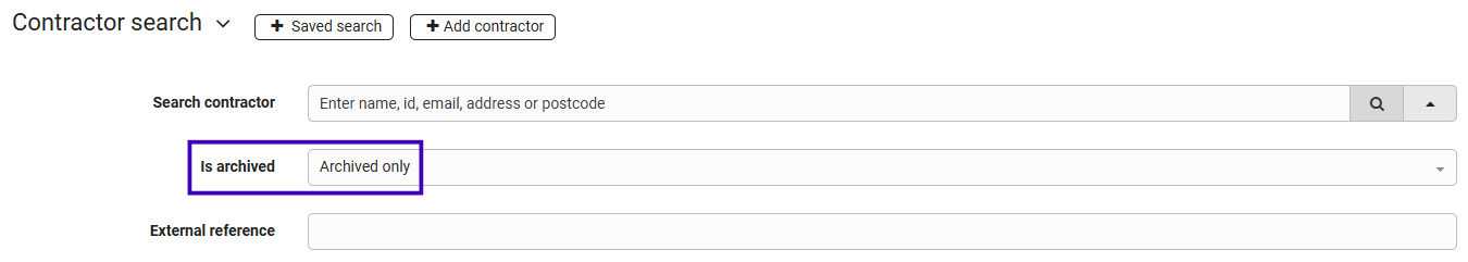 Once the contractor has been archived for a week, they will drop off this list and be moved to the 'Archived' section. To search for your archived contractors, you will need to change the 'Is archived' filter to 'Archived only', and then click on the search icon: