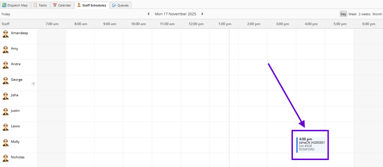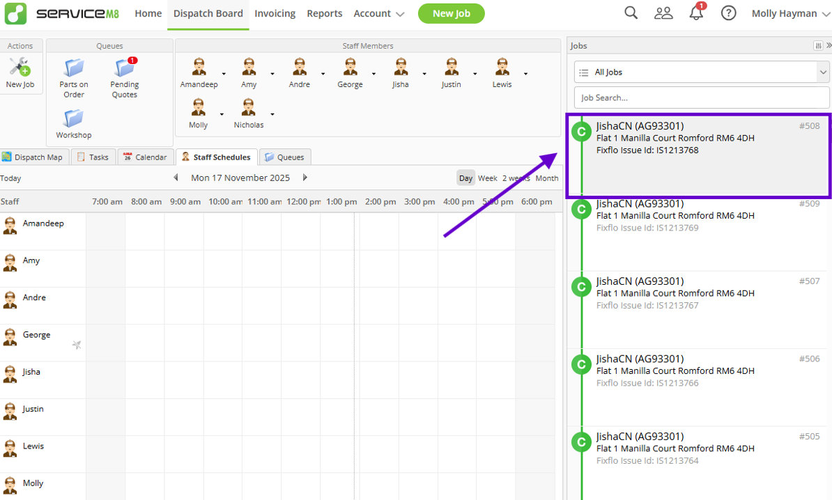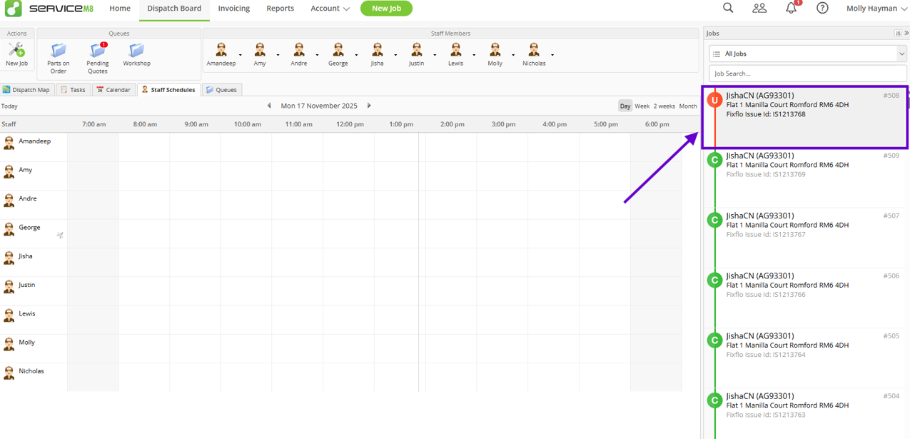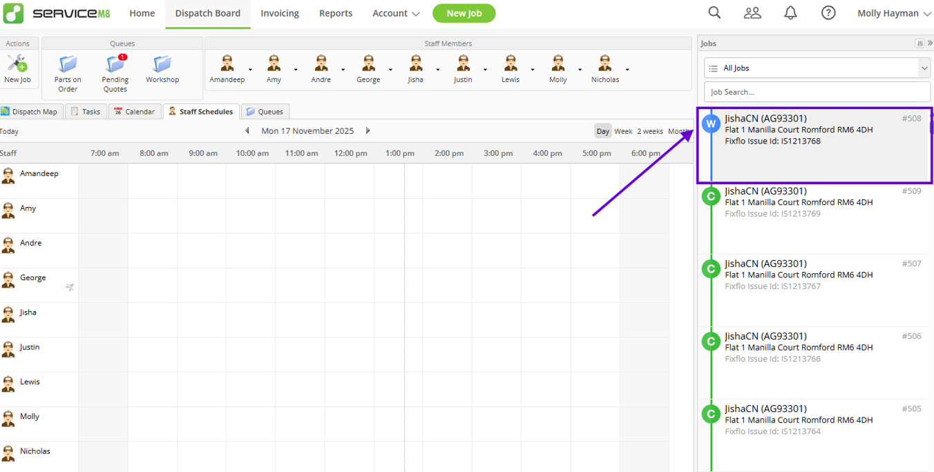 You can then drag the job to the ServiceM8 scheduler, which will sync across the correct date & time to Fixflo.