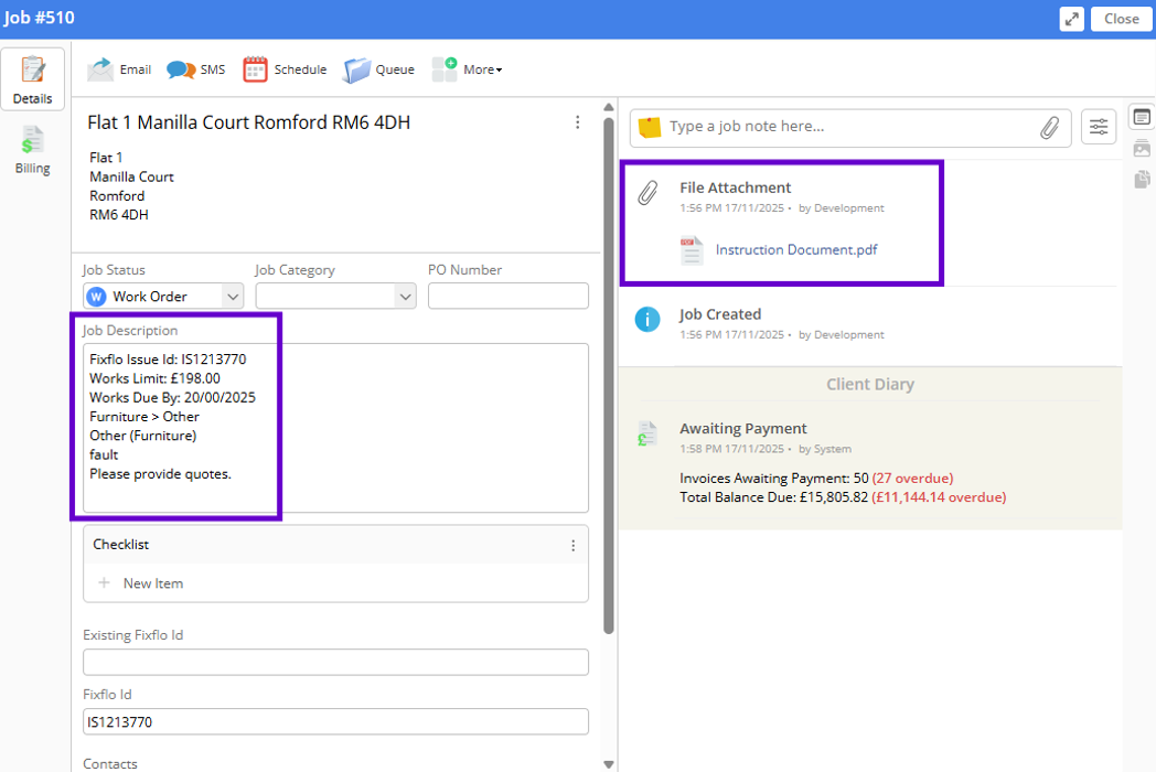 When a job is instructed to a contractor in Fixflo, a Works Order will appear in ServiceM8 under the correct Client (Agency), and Site (property), along with a clear, combined description, and any files or photos.