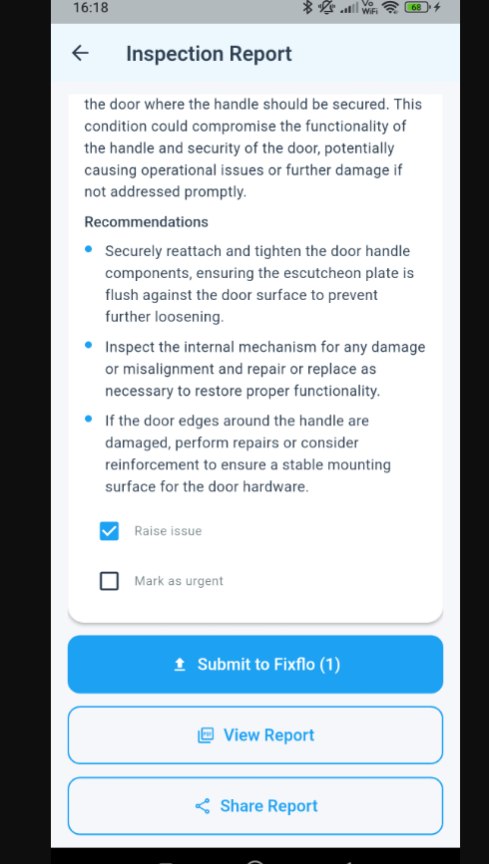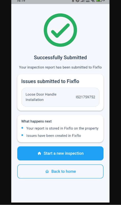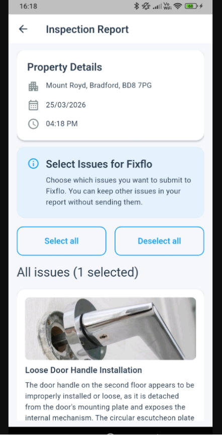 After completing an inspection, you can send selected items directly to Fixflo as issues and optionally mark them as high priority.