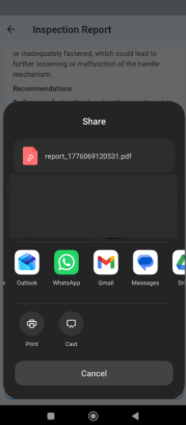 Reports are available as a PDF within the app, can be downloaded, and shared via the share button link (such as email or WhatsApp).