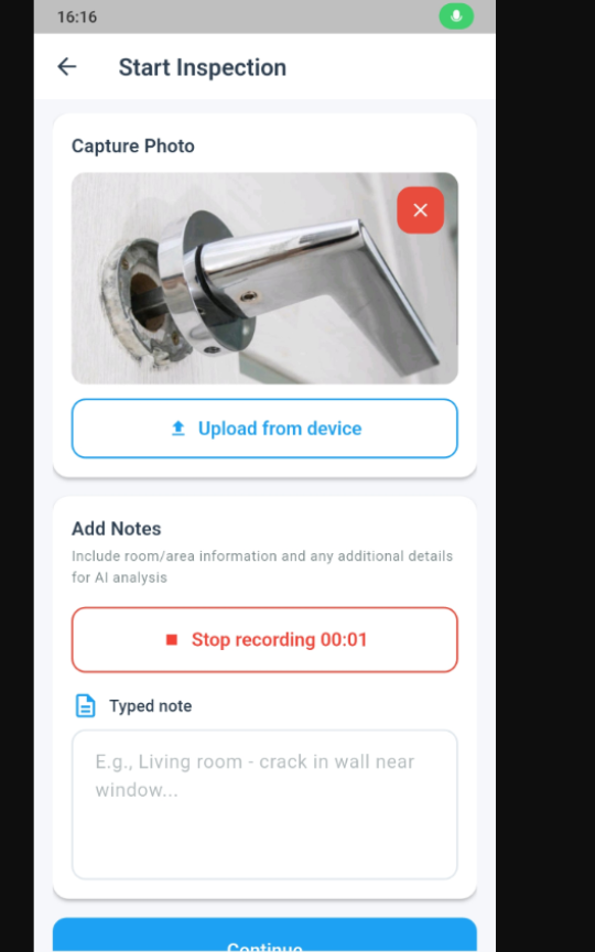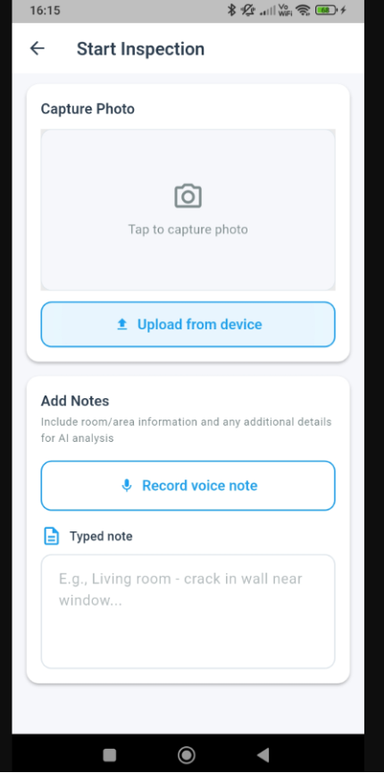 During an inspection, you can take photos, upload images from your camera roll, and add typed or voice notes as you move through the property.